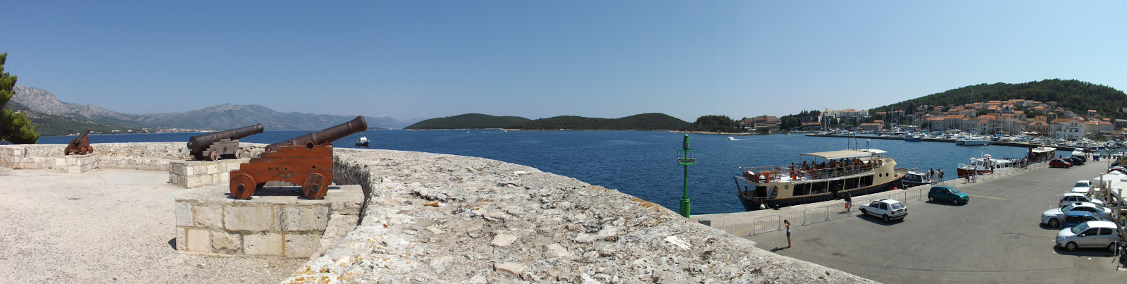 W pełnym słońcu basen portowy po wschodniej części Starego Miasta prezentuje się wspaniale. Po prawej stronie w tle widać marinę, z mnóstwem ekskluzywnych jachtów. Jednak te największe i najwspanialsze cumują po stronie zachodniej miasta, przy nabrzeżu Franje Tuđmana, opodal hotelu Korčula. Bliżej nabrzeże portowe, gdzie między innymi cumuje M/S Liburnija w swej drodze z Dubrownika do Rijeki. Także wiele statków wycieczkowych tam właśnie przyjmuje na pokład swych pasażerów. Tam też można wynająć taksówkę wodną na przykład na pobliską wyspę Badija, być może także na słynną plażę Przina niedaleko Lumbardy. Po lewej stronie armaty nadal gotowe do obrony miasta przed najazdem ;)![]() |