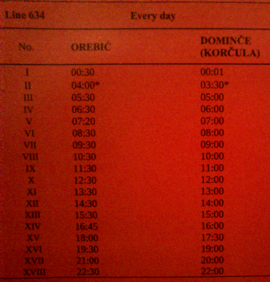 | Rozkład promów na trasie Orebič-Dominče (sezon letni 2012) |