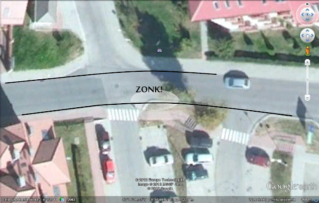 This crossroad is in Cracow, Poland at GPS position 50°00'36.27"N 19°56'44.93"E. For drivers riding from the left right boundary of the road is intuitively seen as black line superimposed over the picture. But...